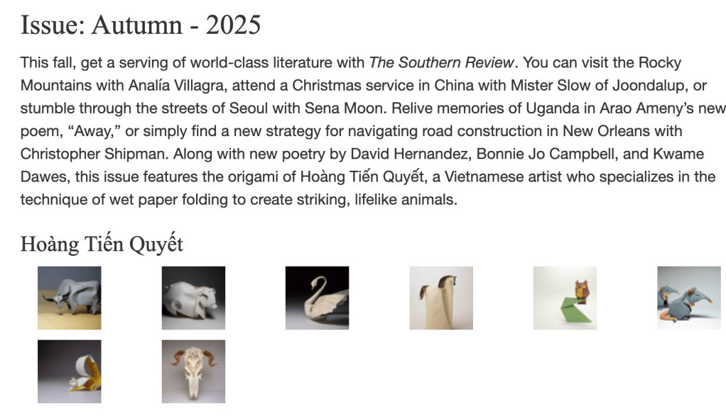 FICTION – Scaffolding for the Strays Scaffolding for the Strays The Southern Review – Autumn 2025 “The sun is setting. The sun sets at a very late hour nowadays.” Share this: Click to share on X (Opens in new window) X Click to share on Facebook (Opens in new window) Facebook Like Loading... Related Posted on October 11, 2025