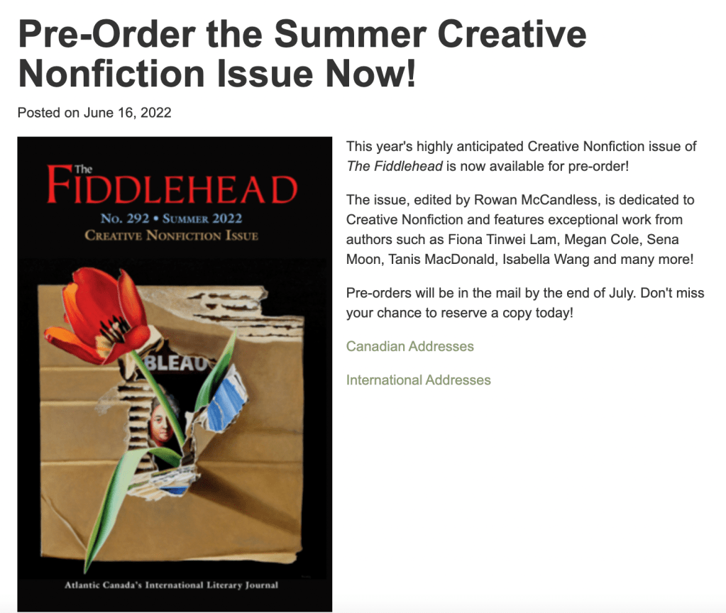 The Fiddlehead – Summer Creative Nonfiction Issue, No. 292